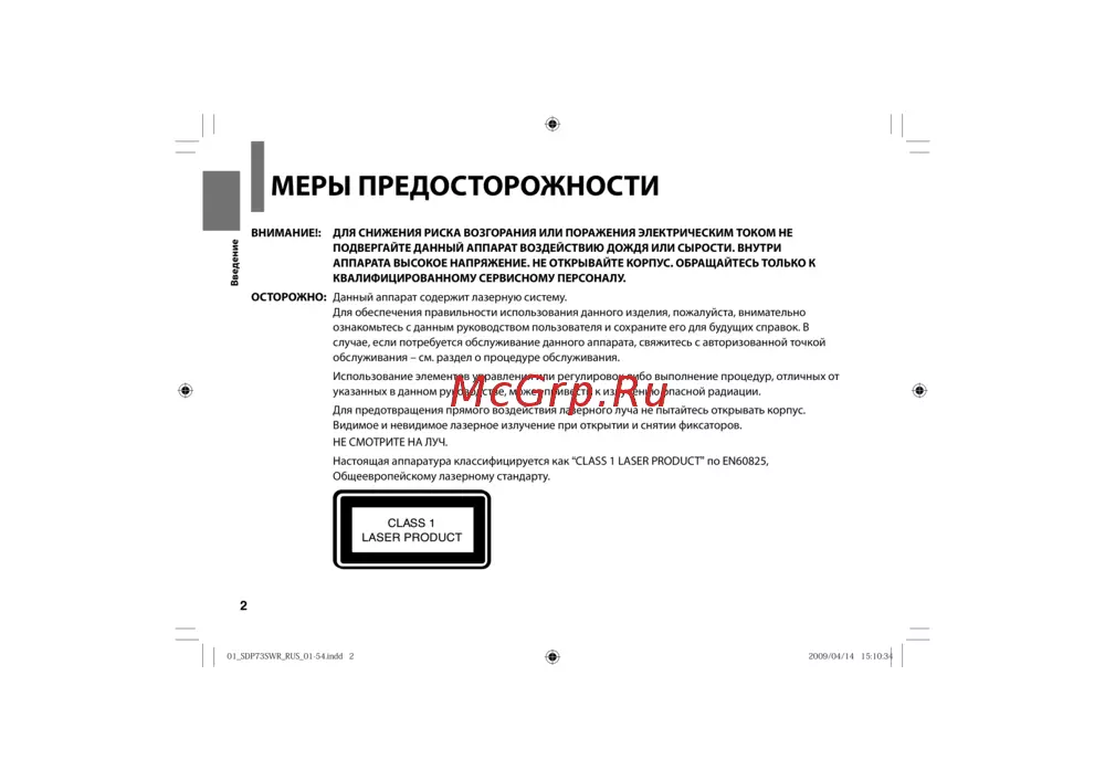 Для предотвращения прямого воздействия лазерного луча не пытайтесь открывать корпус.