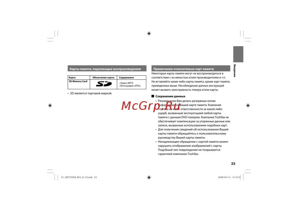 Toshiba SDP73SWR [23/80] Карты памяти подлежащие воспроизведению