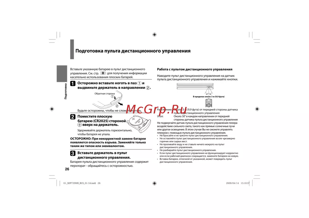 • Вставка батареи, отличной от указанной, может повредить пульт