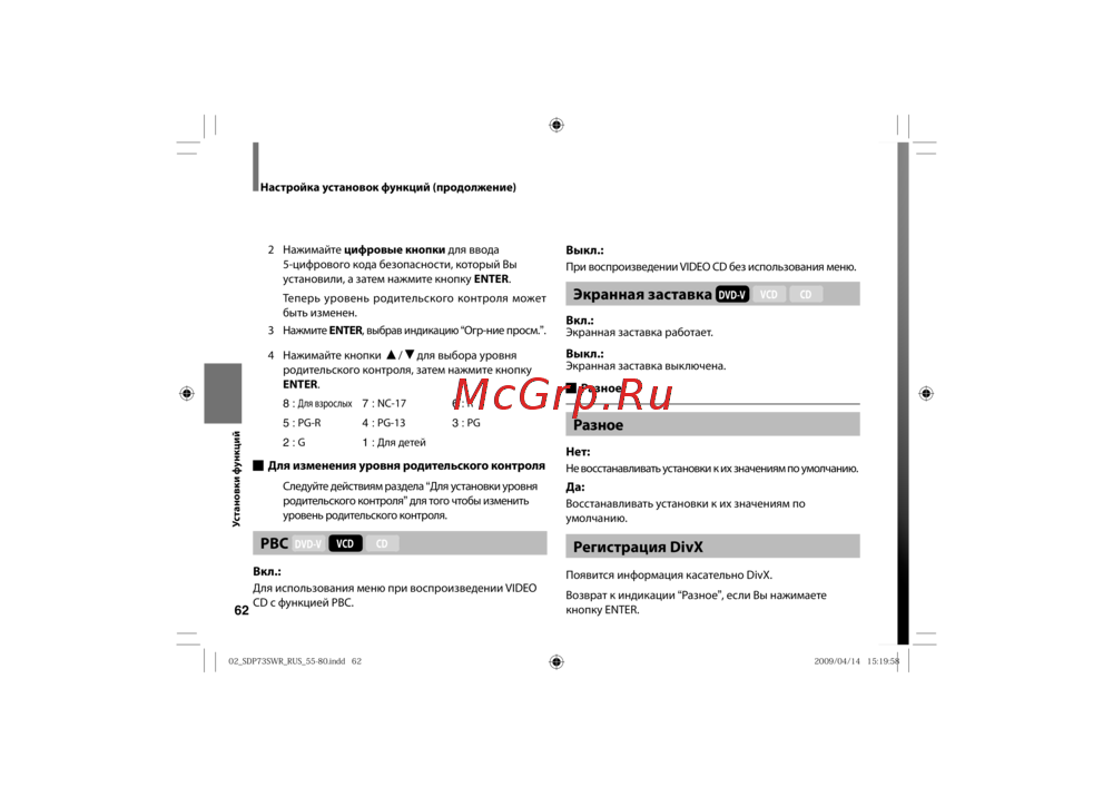 - Входные сигналы частотой 88 2 кгц или выше с гнезда bitstream pcm конвертируются с понижением частоты до 44 1 кгц или 48 кгц когда выбрана опция вкл стереоэффектов воспроизводится диск с защитой авторских прав на диске с защитой авторских прав квантизация будет ограничена до 16 бит p.72