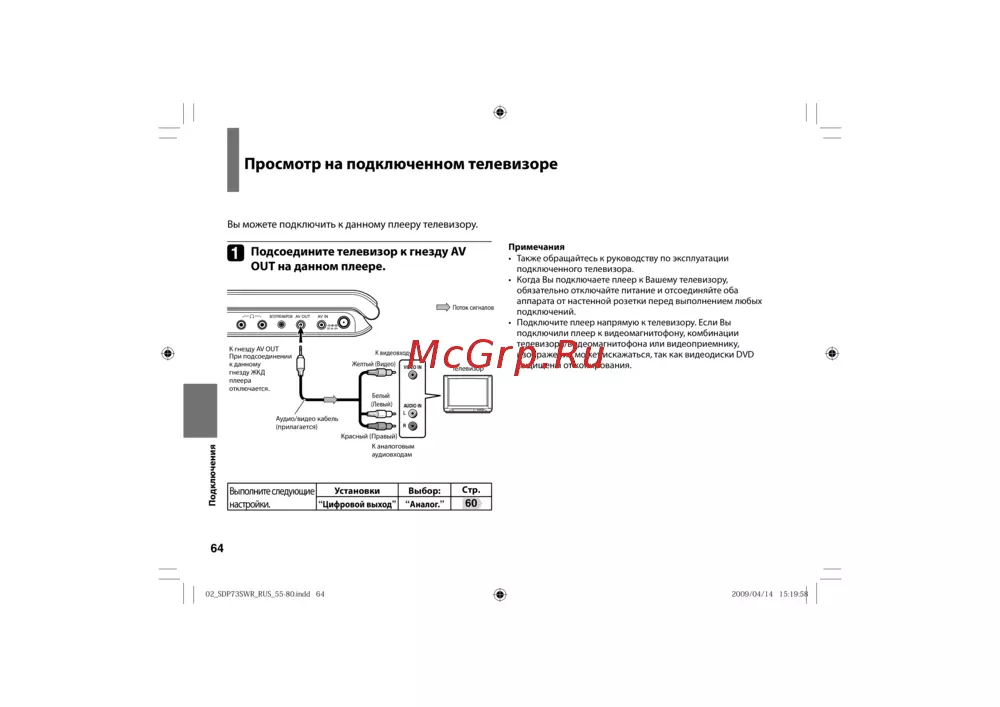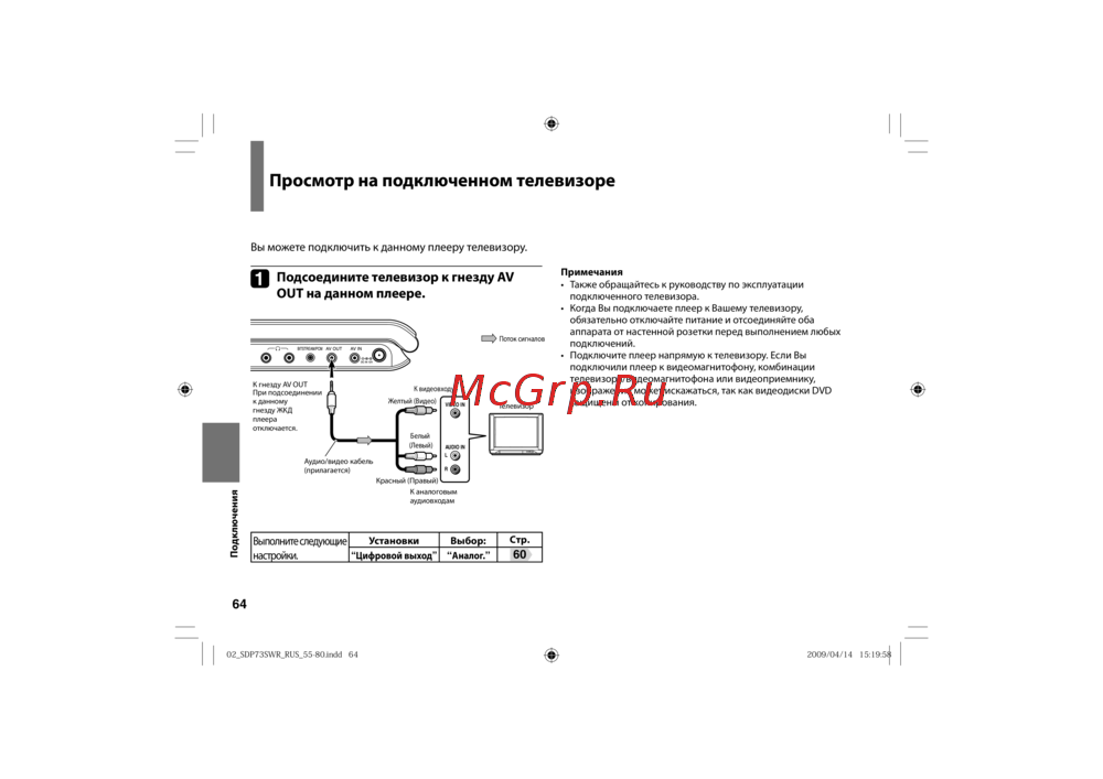 - Подсоедините телевизор к гнезду av out на данном плеере p.64