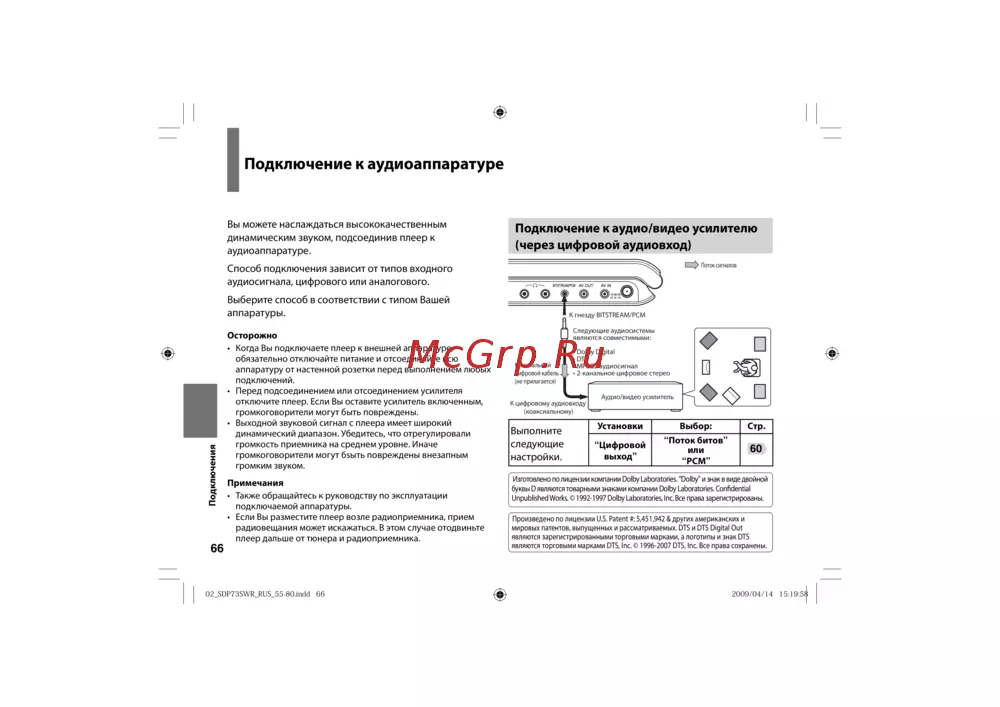 - Подключение к аудио видео усилителю через цифровой аудиовход p.66