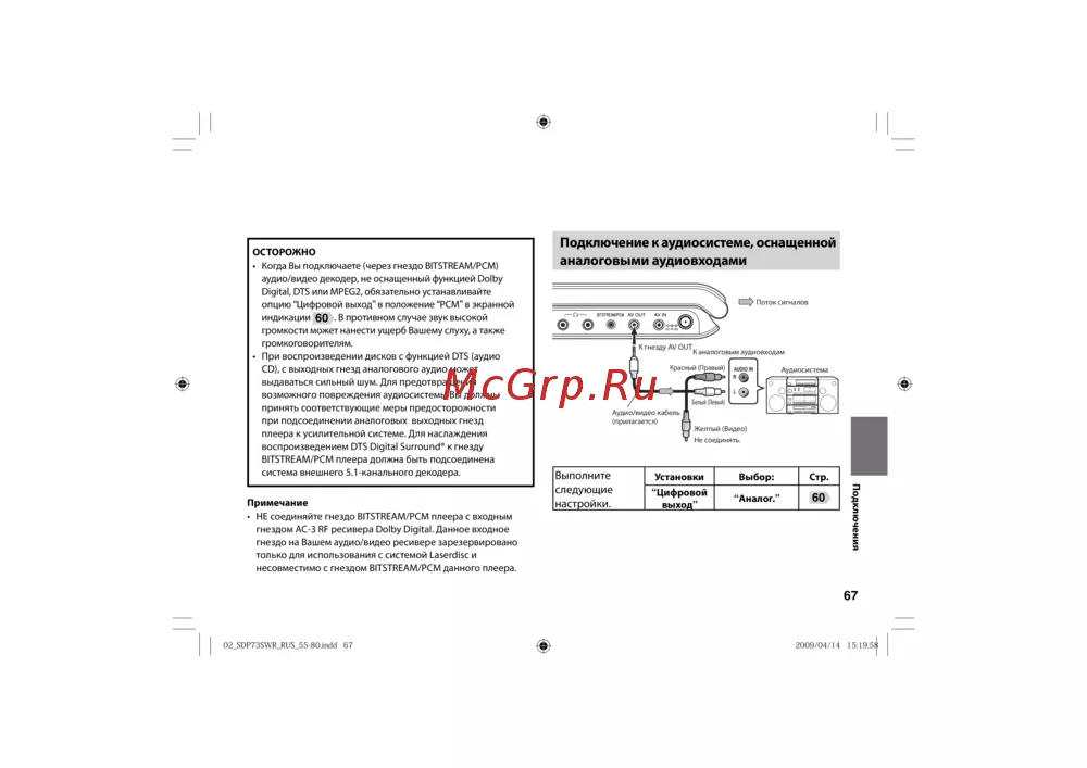 - Способ подключения зависит от типов входного аудиосигнала цифрового или аналогового p.66
