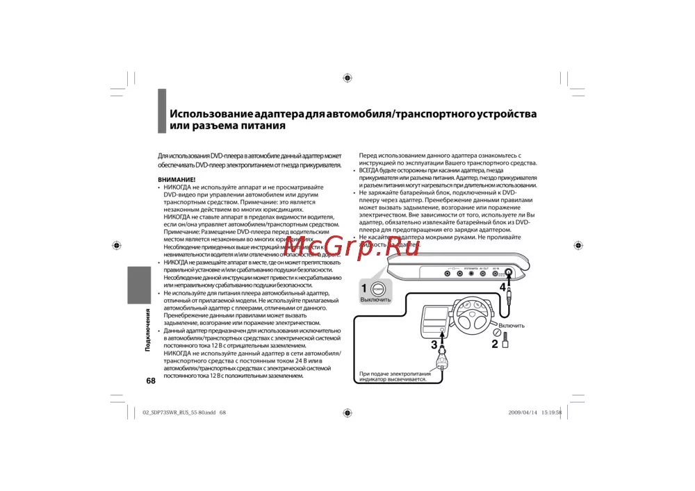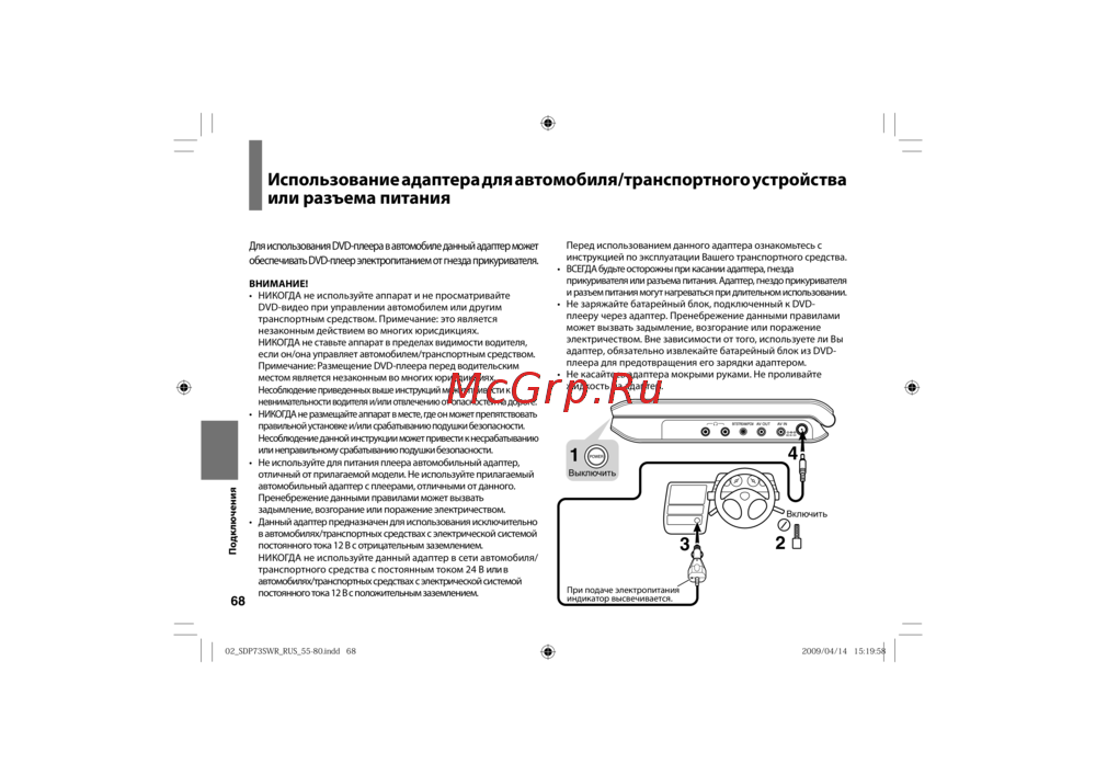 - Для использования dvd плеера в автомобиле данный адаптер может обеспечивать dvd плеер электропитанием от гнезда прикуривателя p.68