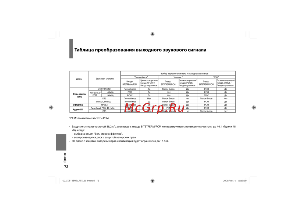 Toshiba SDP73SWR [72/80] Таблица преобразования выходного звукового сигнала