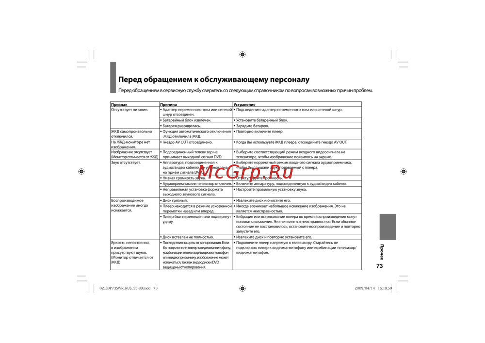 - Перед обращением в сервисную службу сверьтесь со следующим справочником по вопросам возможных причин проблем p.73