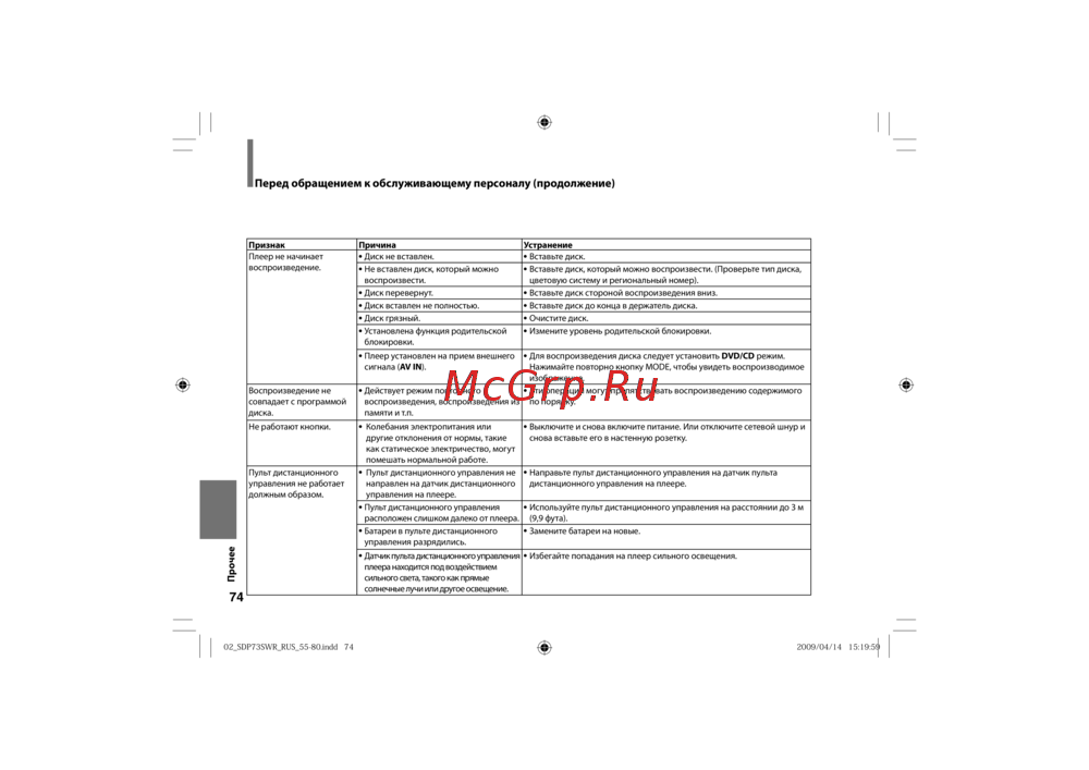 - Перед обращением в сервисную службу сверьтесь со следующим справочником по вопросам возможных причин проблем p.73