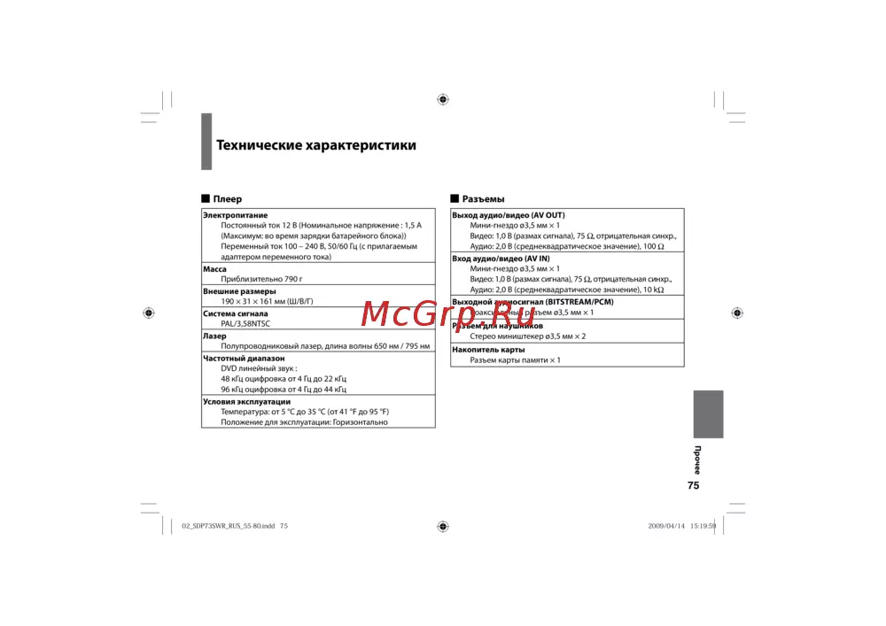 Toshiba SDP73SWR [75/80] Технические характеристики
