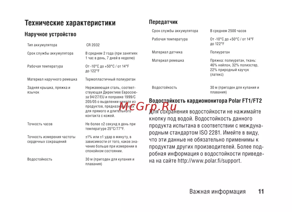 - Водостойкость кардиомонитора polar ft1 ft2 p.11