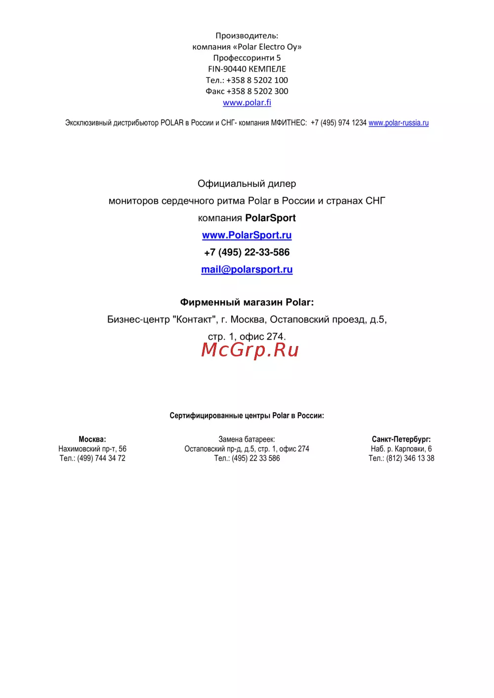 Эксклюзивный дистрибьютор POLAR в России и СНГ- компания МФИТНЕС: +7 (495) 974 1234 www.polar-russia.ru