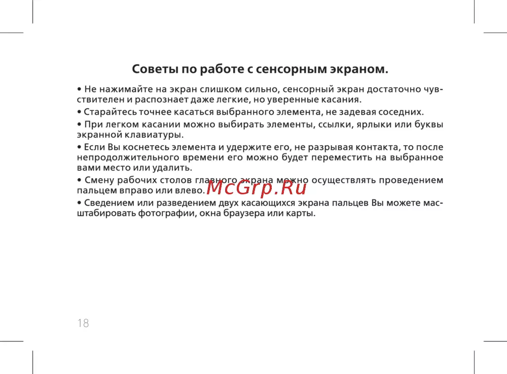Советы по работе с сенсорным экраном Не нажимайте на экран слишком сильно сенсорный экран достаточно чув ствителен и распознает даже легкие ноуверенные касания Старайтесь точнее касаться выбранного элемента не задевая соседних При легком касании можно выбирать элементы ссылки ярлыки или буквы экранной клавиатуры Если Вы коснетесь элемента и удержите его не разрывая контакта то после непродолжительного времени его можно будет переместить на выбранное вами место или удалить Смену рабочих столов главного экрана можно осуществлять проведением пальцем вправо или влево Сведением или разведением двух касающихся экрана пальцев Вы можете мас штабировать фотографии окна браузера или карты