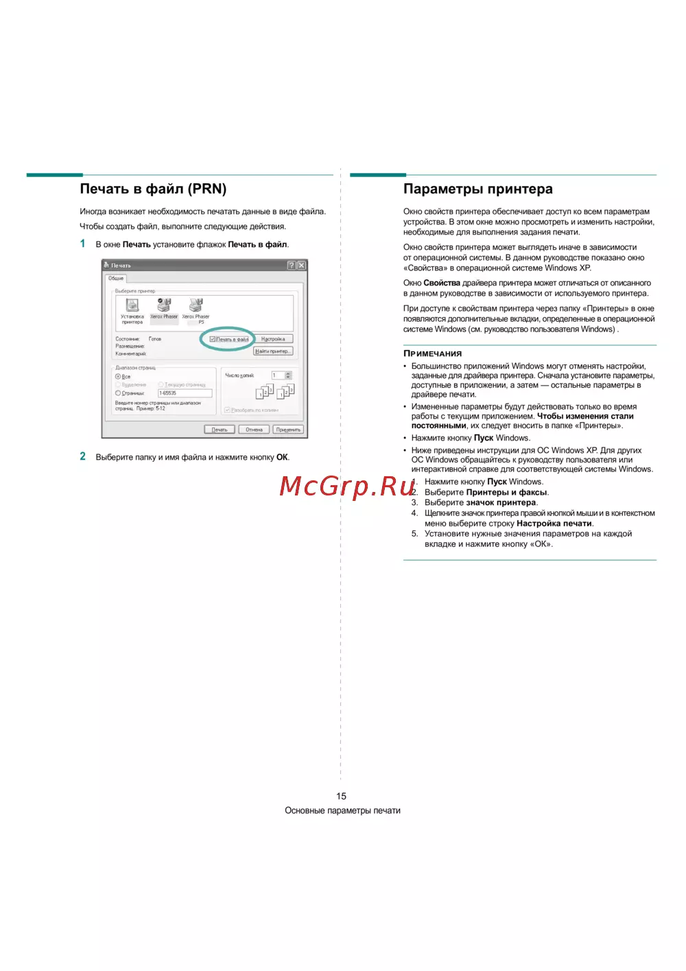 Печать в файл РИМ Параметры принтера Иногда возникает необходимость печатать данные в виде файла Окно свойств принтера обеспечивает доступ ко всем параметрам устройства В этом окне можно просмотреть и изменить настройки необходимые для выполнения задания печати Чтобы создать файл выполните следующие действия 1 В окне Печать установите флажок Печать в файл Окно свойств принтера может выглядеть иначе в зависимости от операционной системы В данном руководстве показано окно Свойства в операционной системе Windows ХР Окно Свойства драйвера принтера может отпичаться от описанного в данном руководстве в зависимости от используемого принтера При доступе к свойствам принтера через папку Принтеры в окне появляются дополнительные вкладки определенные в операционной системе Windows см руководство пользователя Windows ПРИМЕЧАНИЯ Большинство приложений Windows могут отменять настройки заданные дпя драйвера принтера Сначала установите параметры доступные в приложении а затем остальные параметры в драйвере печати Измененные параметры будут действовать только во время работы с текущим приложением Чтобы изменения стали постоянными их следует вносить в папке Принтеры Нажмите кнопку Пуск Windows Ниже приведены инструкции для ОС Windows ХР Для других ОС Windows обращайтесь к руководству попьзоватепя ипи интерактивной справке для соответствующей системы Windows 2 Выберите папку и имя файла и нажмите кнопку ОК 1 Нажмите кнопку Пуск Windows 2 Выберите Принтеры и факсы 3 Выберите значок принтера 4 Щелкните значок принтера правой кнопкой мыши и в контекстном меню выберите строку Настройка печати 5 Установите нужные значения параметров на каждой вкладке и нажмите кнопку ОК 15 Основные параметры печати