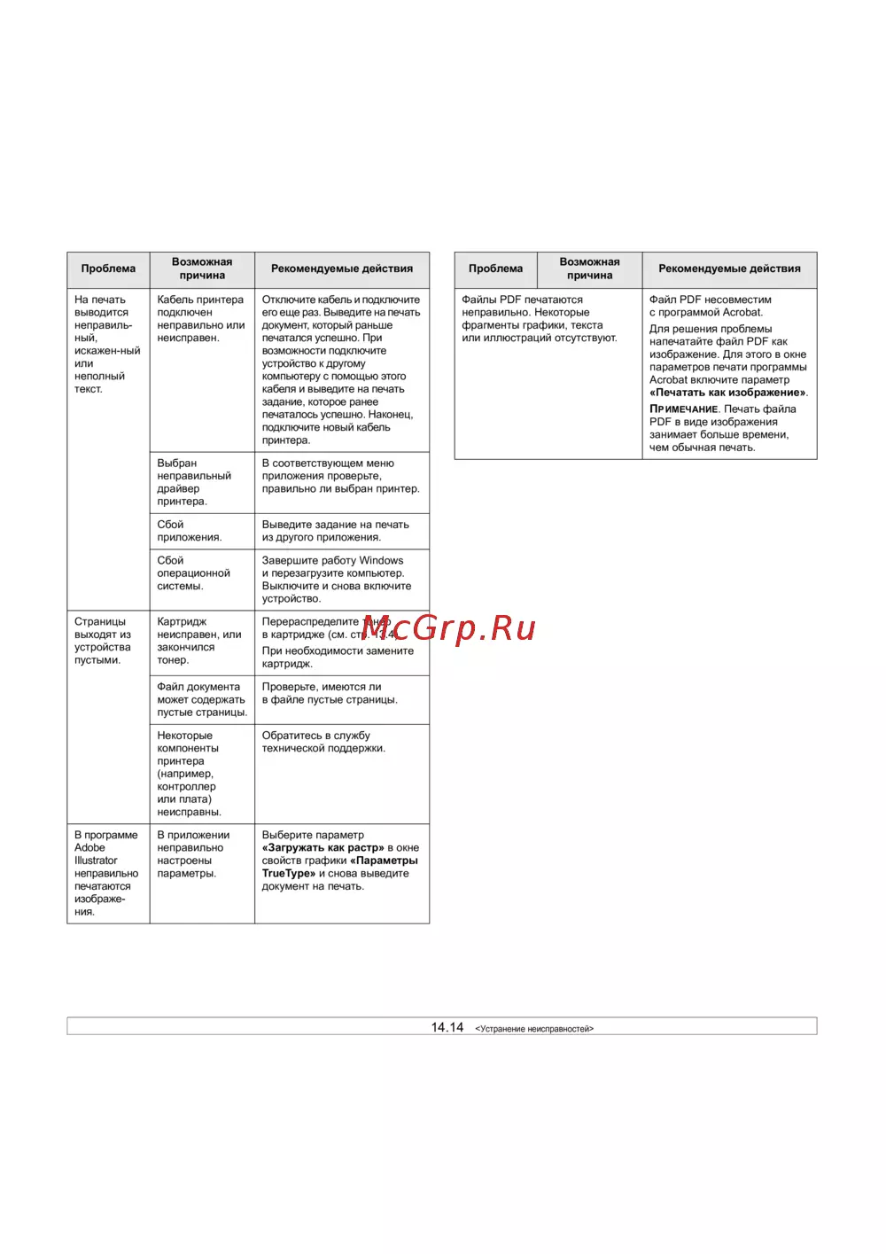 Проблема На печать выводится неправиль ный искажен ный или неполный текст Страницы выходят из устройства пустыми В программе Adobe Illustrator неправильно печатаются изображе ния Возможная причина Кабель принтера подключен неправильно или неисправен Рекомендуемые действия Отключите кабель и подключите его еще раз Выведите на печать документ который раньше печатался успешно При возможности подключите устройство к другому компьютеру с помощью этого кабеля и выведите на печать задание которое ранее печаталось успешно Наконец подключите новый кабель принтера Выбран неправильный драйвер принтера В соответствующем меню приложения проверьте правильно ли выбран принтер Сбой приложения Выведите задание на печать из другого приложения Сбой операционной системы Завершите работу Windows и перезагрузите компьютер Выключите и снова включите устройство Картридж неисправен или закончился тонер Перераспределите тонер в картридже см стр 13 4 Файл документа может содержать пустые страницы Проверьте имеются ли в файле пустые страницы Некоторые компоненты принтера например контроллер или плата неисправны Обратитесь в службу технической поддержки В приложении неправильно настроены параметры Выберите параметр Загружать как растр в окне свойств графики Параметры TrueType и снова выведите документ на печать Проблема Возможная причина Файлы PDF печатаются неправильно Некоторые фрагменты графики текста или иллюстраций отсутствуют Рекомендуемые действия Файл PDF несовместим с программой Acrobat Для решения проблемы напечатайте файл PDF как изображение Для этого в окне параметров печати программы Acrobat включите параметр Печатать как изображение ПРИМЕЧАНИЕ Печать файла PDF в виде изображения занимает больше времени чем обычная печать При необходимости замените картридж 14 14 Устранение неисправностей