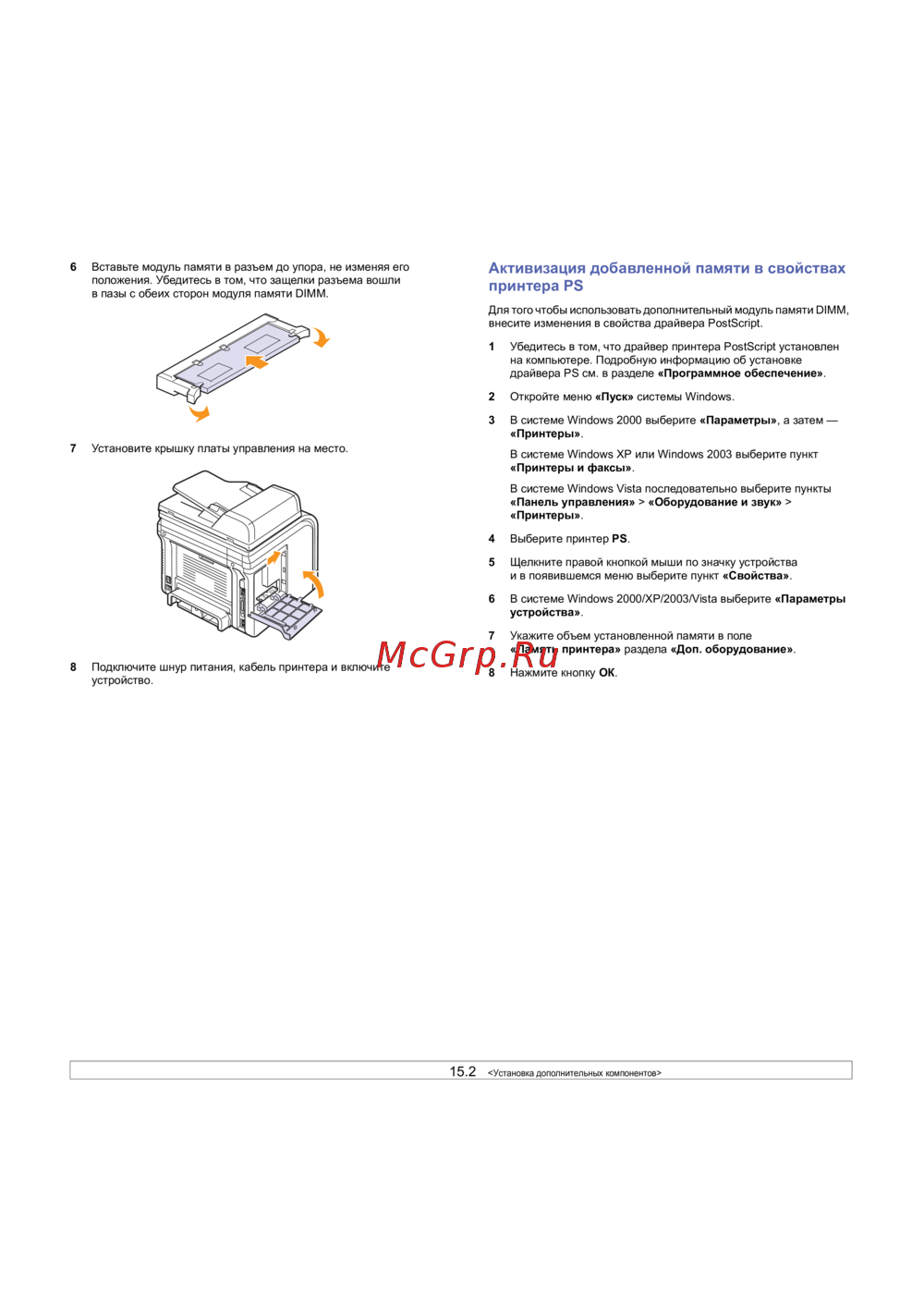 6 Вставьте модуль памяти в разъем до упора не изменяя его положения Убедитесь в том что защелки разъема вошли в пазы с обеих сторон модуля памяти DIMM Активизация добавленной памяти в свойствах принтера PS Для того чтобы использовать дополнительный модуль памяти DIMM внесите изменения в свойства драйвера PostScript 1 Убедитесь в том что драйвер принтера PostScript установлен на компьютере Подробную информацию об установке драйвера PS см в разделе Программное обеспечение 2 Откройте меню Пуск системы Windows 3 В системе Windows 2000 выберите Параметры а затем Принтеры 7 Установите крышку платы управления на место В системе Windows ХР или Windows 2003 выберите пункт Принтеры и факсы В системе Windows Vista последовательно выберите пункты Панель управления Оборудование и звук Принтеры 4 Выберите принтер PS 5 Щелкните правой кнопкой мыши по значку устройства и в появившемся меню выберите пункт Свойства 6 В системе Windows 2000 XP 2003 Vista выберите Параметры устройства 7 Укажите объем установленной памяти в поле Память принтера раздела Доп оборудование 8 Подключите шнур питания кабель принтера и включите устройство 8 Нажмите кнопку ОК 1 5 2 Установка дополнительных компонентов