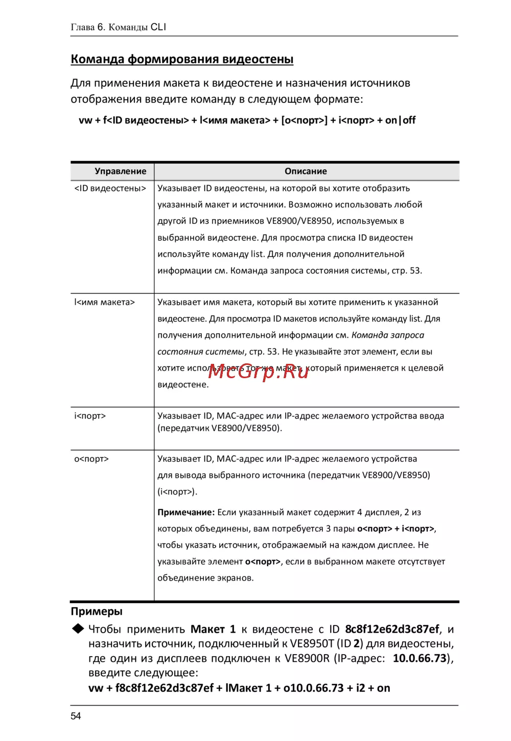 - Чтобы применить макет 1 к видеостене с id 8c8f12e62d3c87ef и назначить источник подключенный к ve8950t id 2 для видеостены где один из дисплеев подключен к ve8900r ip адрес 10 6 3 введите следующее vw f8c8f12e62d3c87ef lмакет 1 o10 6 3 i2 on p.82