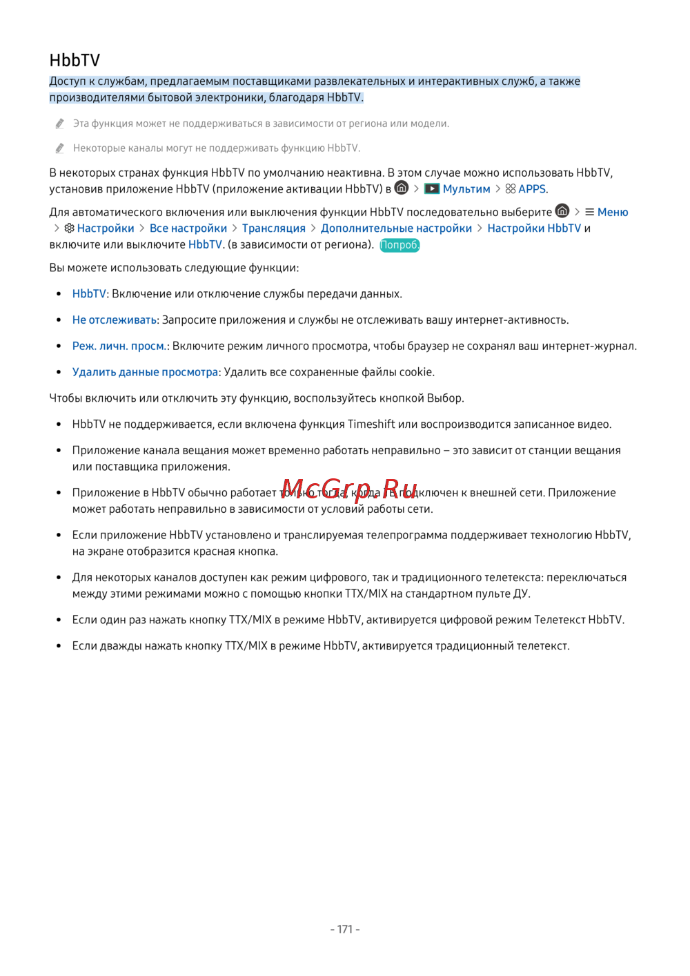• Приложение в HbbTV обычно работает только тогда, когда ТВ подключен к внешней сети. Приложение