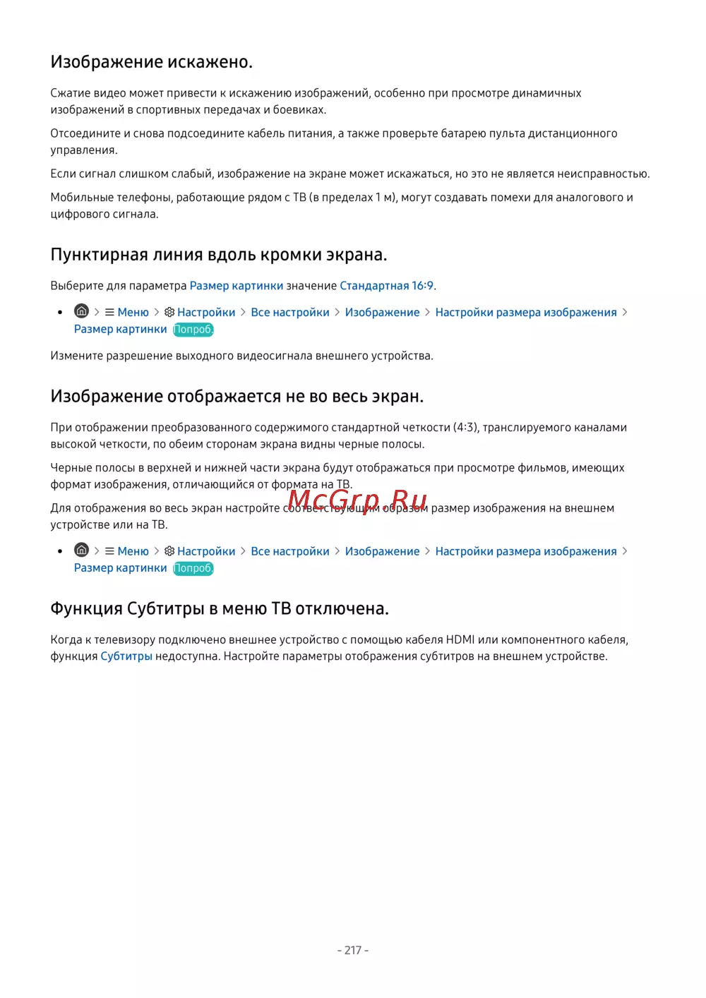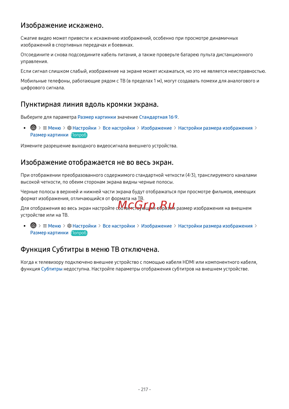 - Если проблема не исчезает попробуйте подключить к тв другое устройство с помощью кабеля hdmi если изображение на экране нормальное неисправность связана с внешним устройством p.251