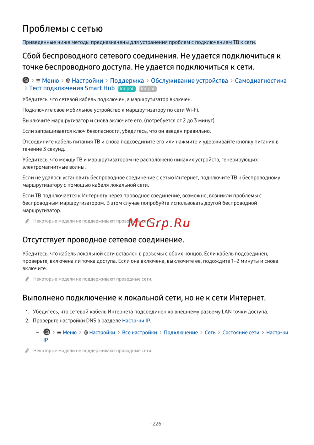 Если ТВ подключается к Интернету через проводное соединение, возможно, возникли проблемы с