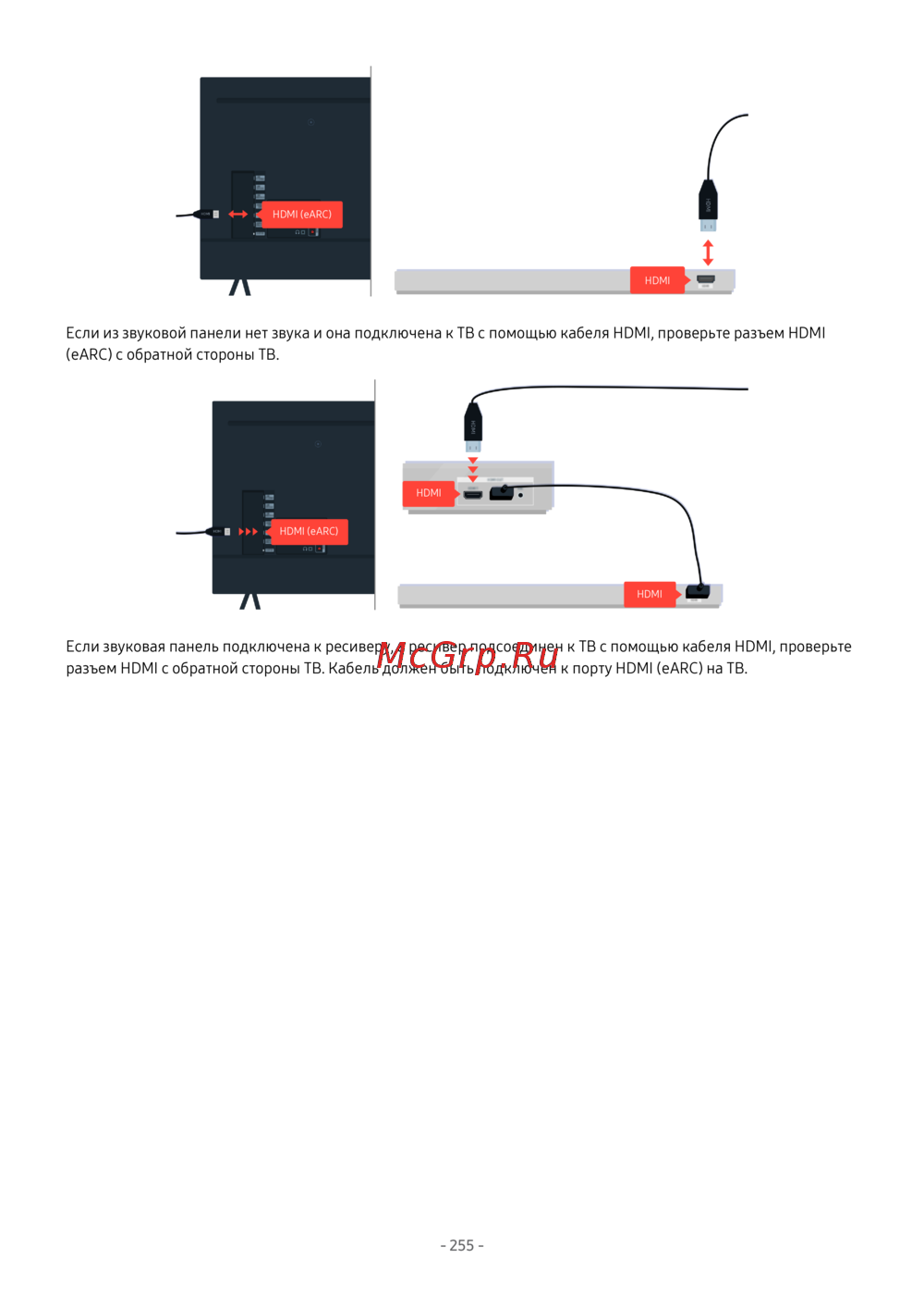 - Если из звуковой панели нет звука и она подключена к тв с помощью кабеля hdmi проверьте разъем hdmi earc с обратной стороны тв p.255