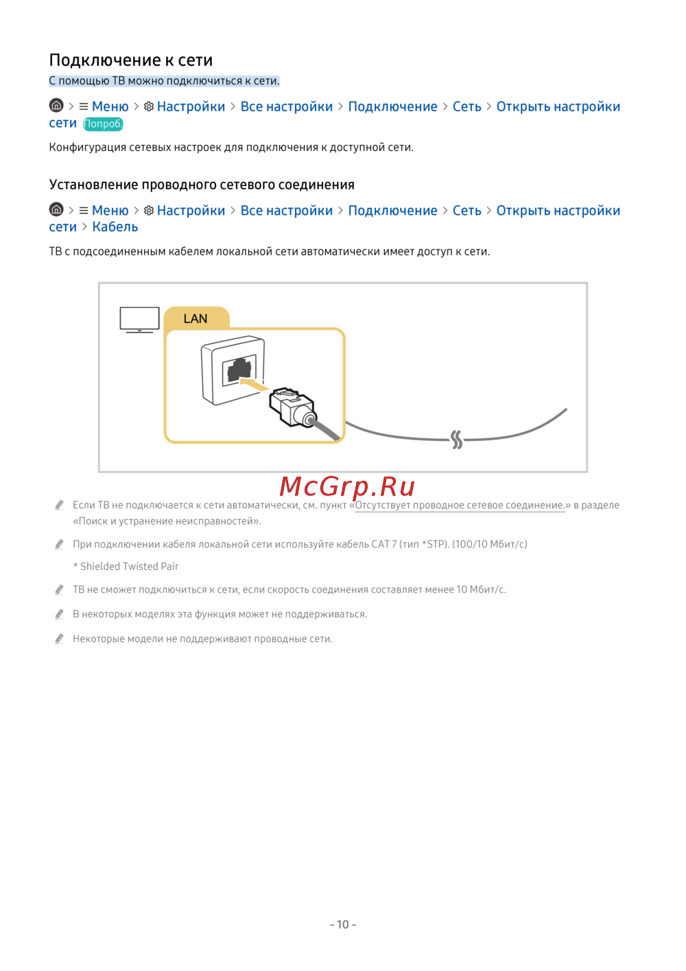 ТВ не сможет подключиться к сети, если скорость соединения составляет менее 10 Мбит/с.