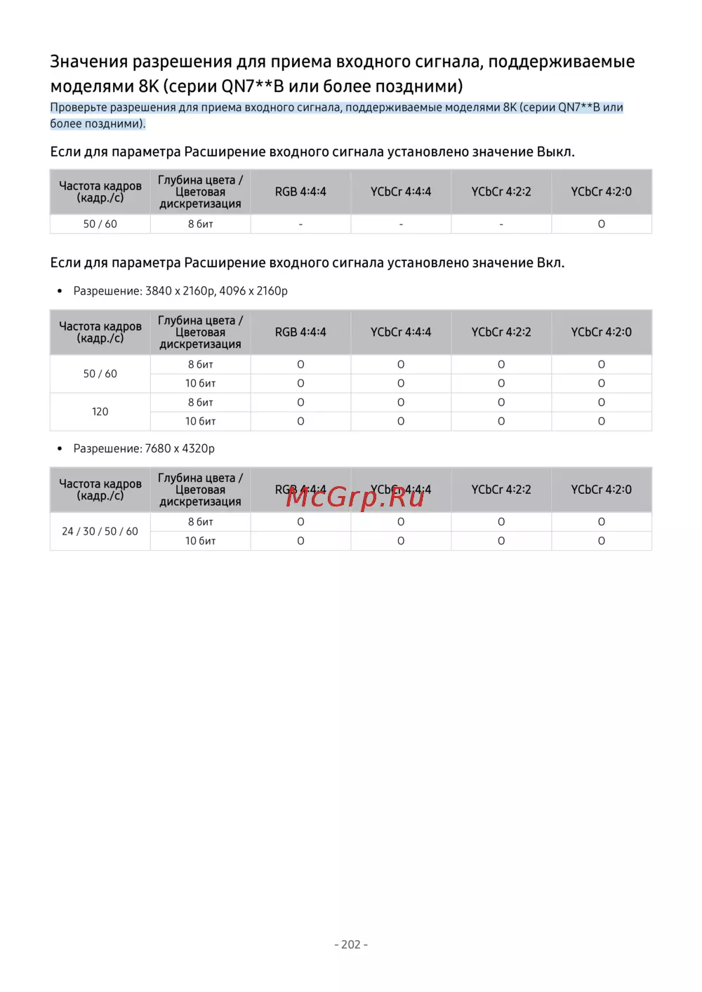 Проверьте разрешения для приема входного сигнала, поддерживаемые моделями 8K (серии QN7**B или