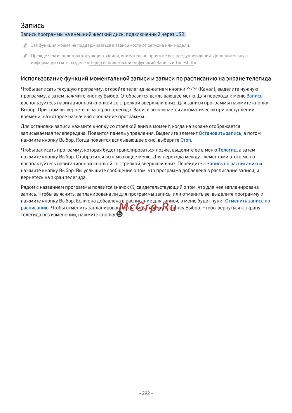 - Использование функций моментальной записи и записи по расписанию на экране телегида p.292