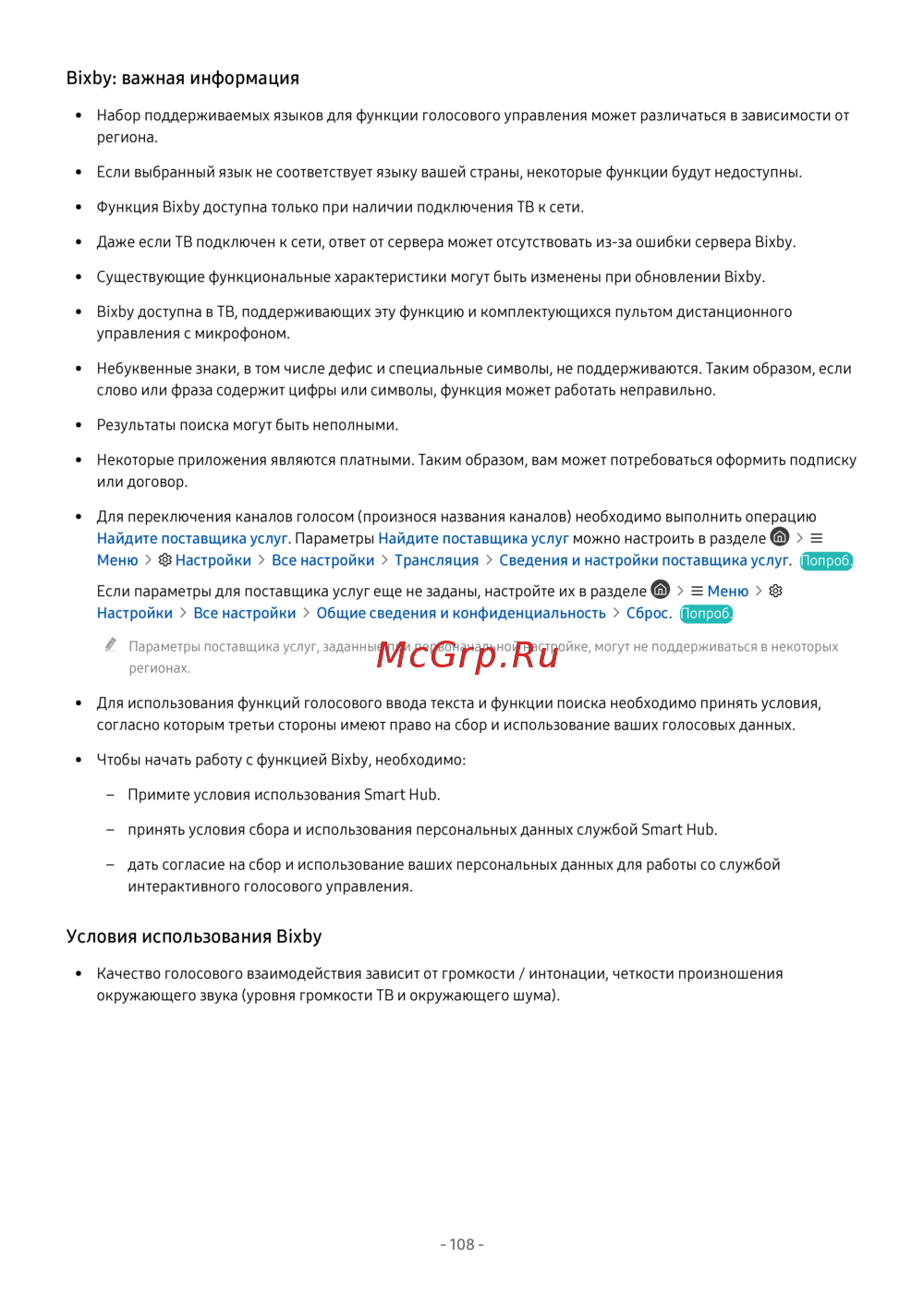 - Для использования функции bixby тв должен быть подключен к сети кроме того вам понадобится микрофон на пульте интеллектуальный пульт ду samsung p.299