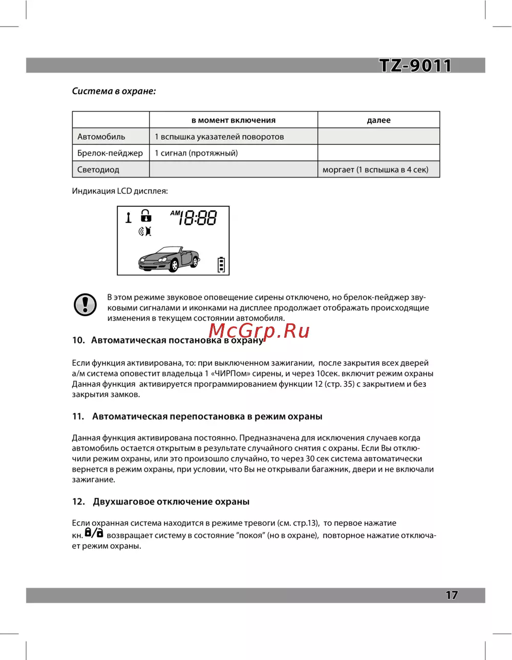 а/м система оповестит владельца 1 «ЧИРПом» сирены, и через 10сек. включит режим охраны