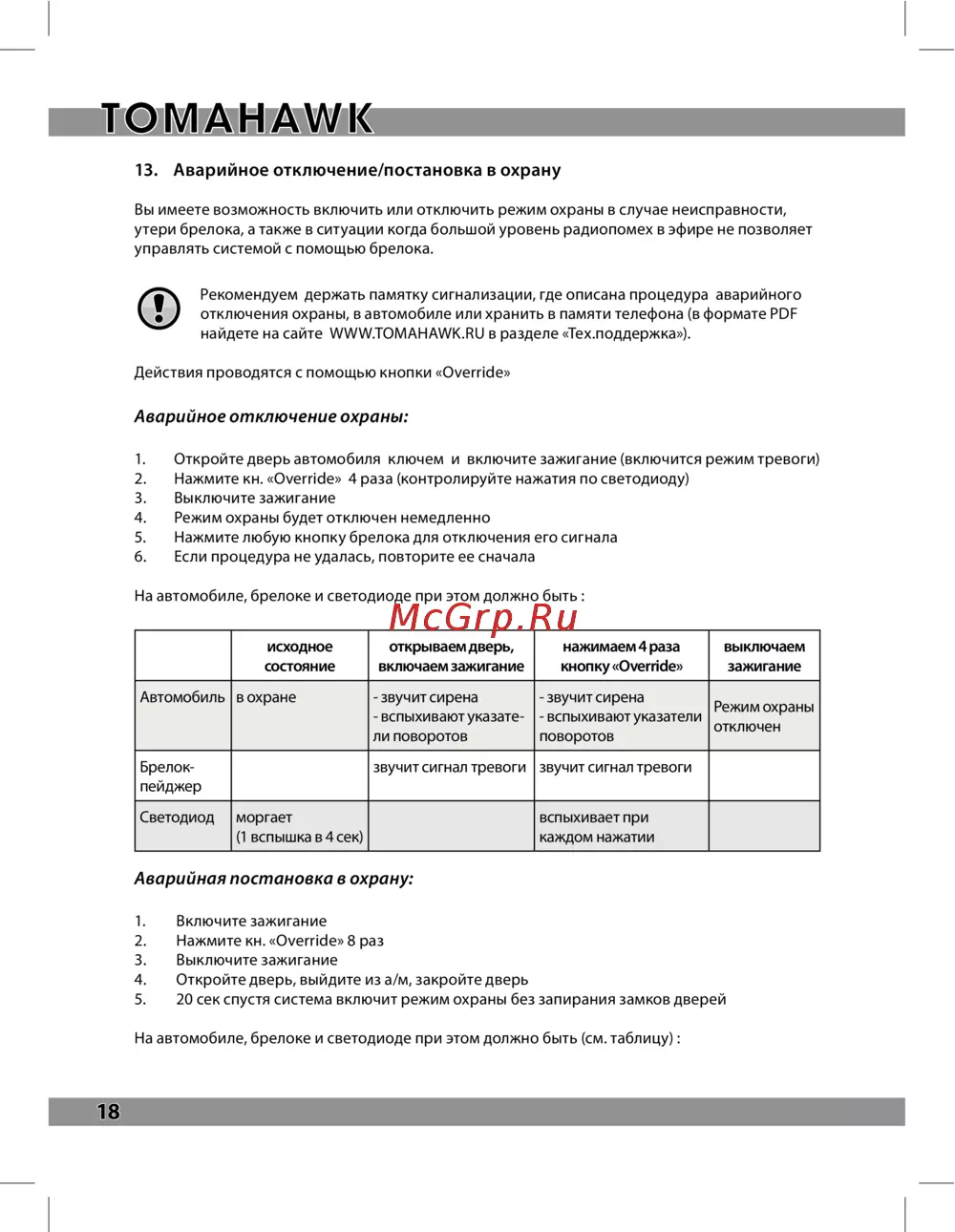 ![Tomahawk T Z - 9011 [18/52] Аварийное отключение постановка в охрану](/views2/1986316/page18/bg12.png)