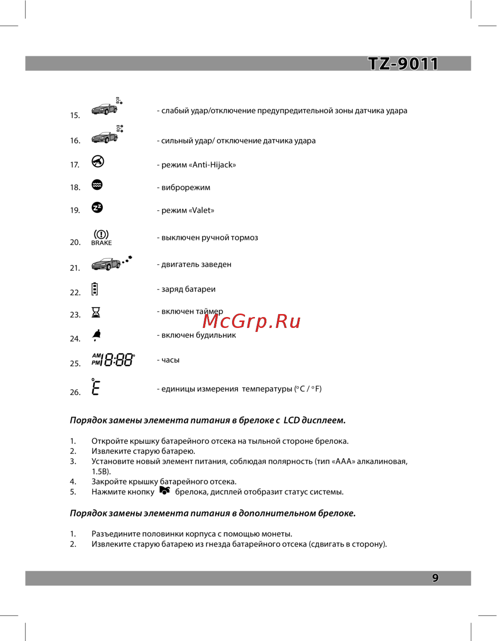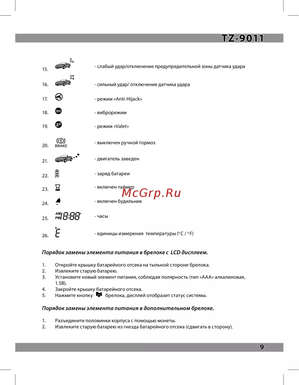 - Порядок замены элемента питания в брелоке с lcd дисплеем p.9