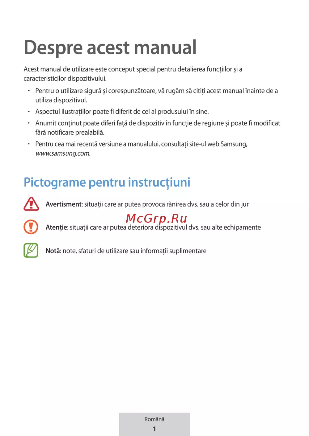 Pentru cea mai recentă versiune a manualului, consultați site-ul web Samsung,