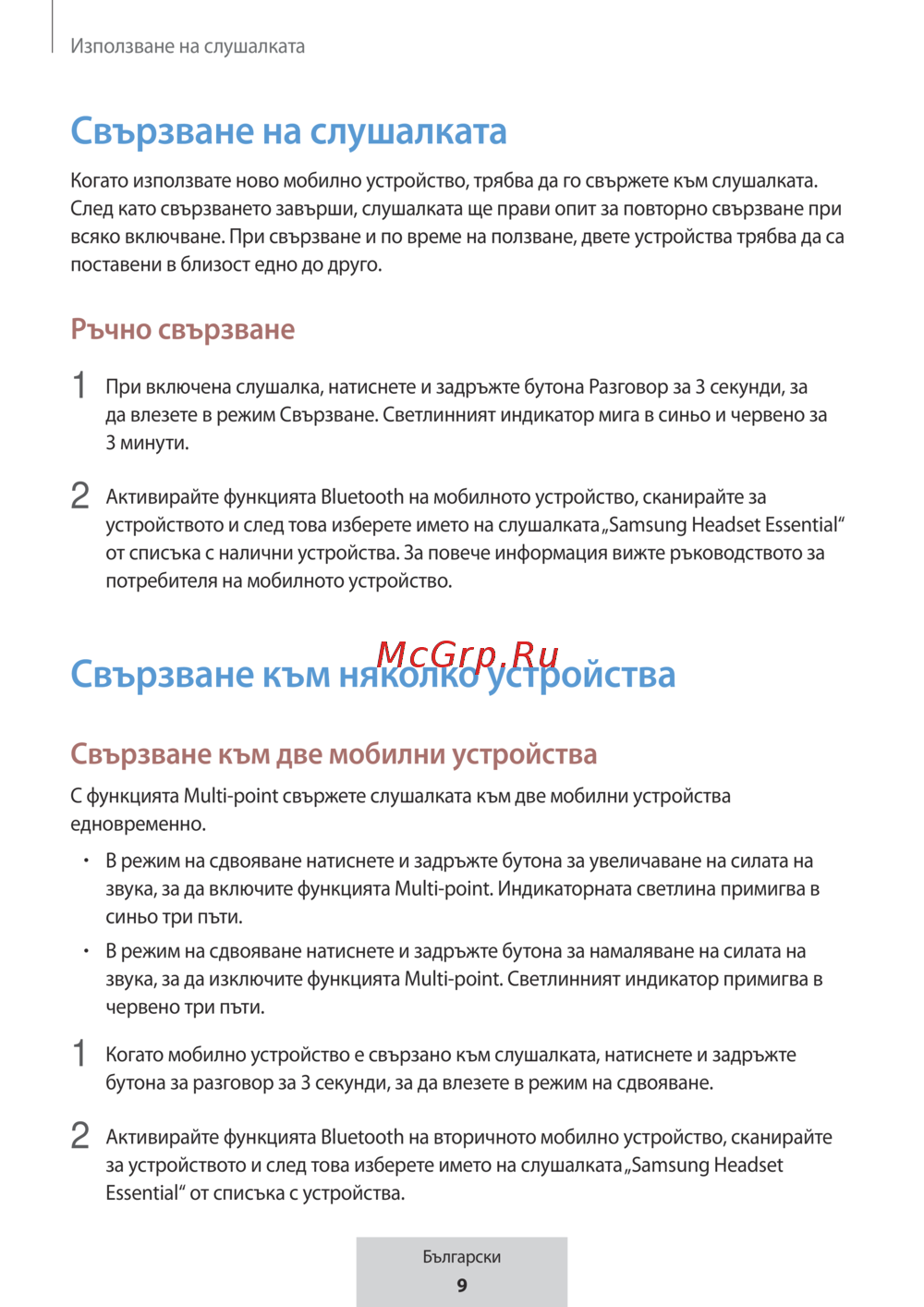 звука, за да изключите функцията Multi‑point. Светлинният индикатор примигва в