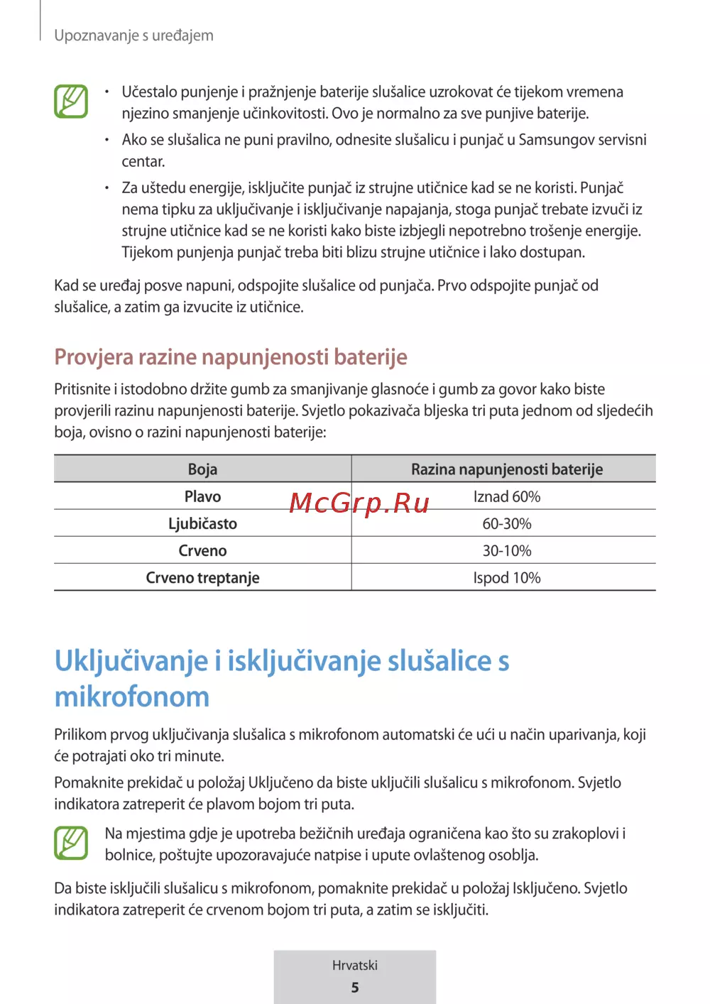 Učestalo punjenje i pražnjenje baterije slušalice uzrokovat će tijekom vremena