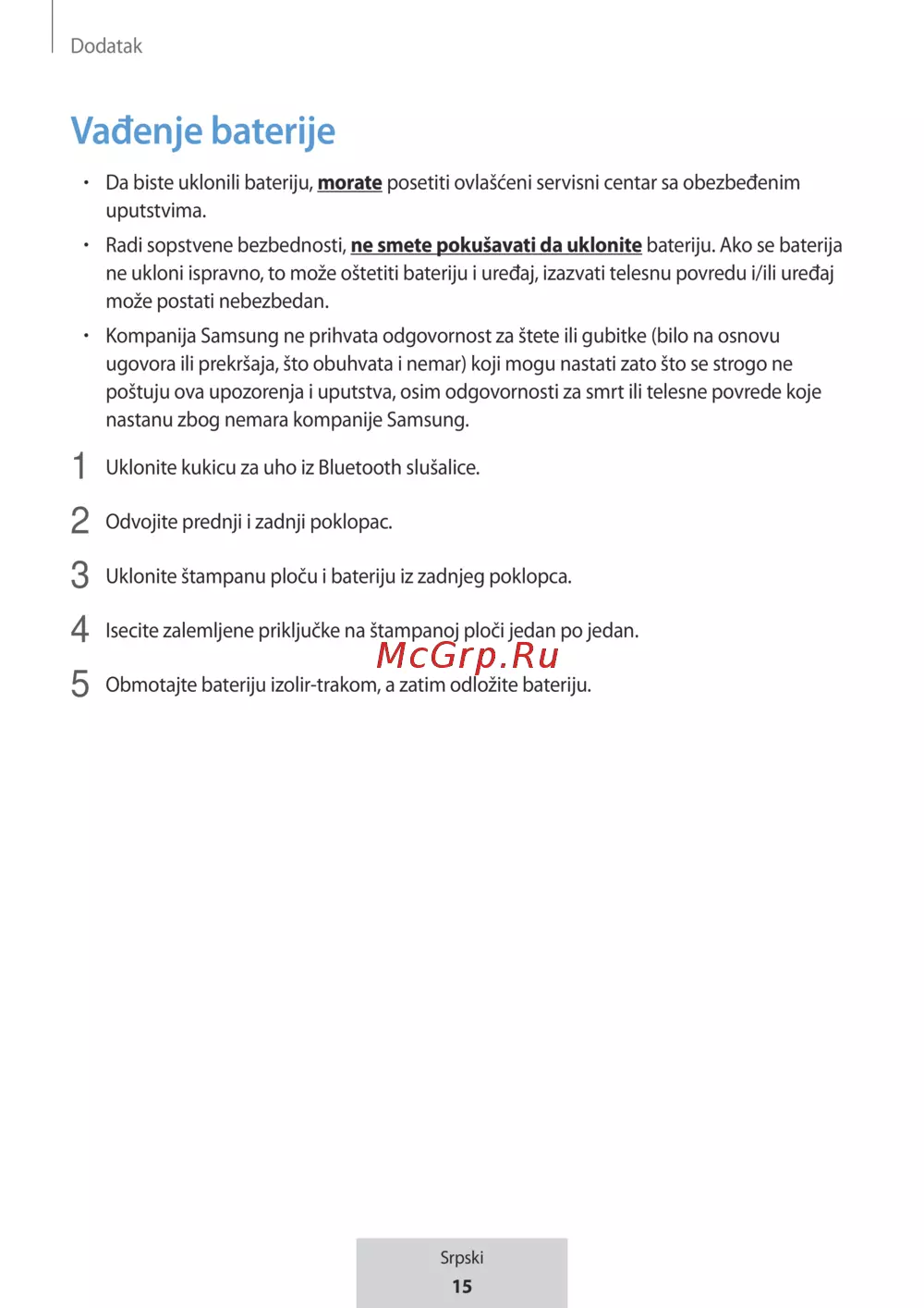 Da biste uklonili bateriju, morate posetiti ovlašćeni servisni centar sa obezbeđenim