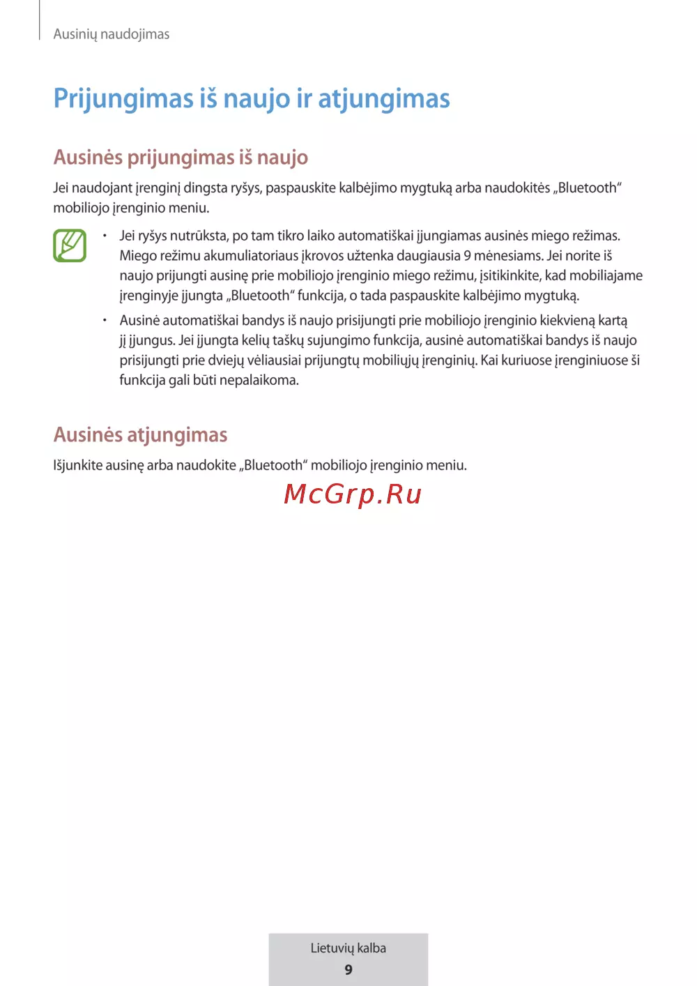 Jei ryšys nutrūksta, po tam tikro laiko automatiškai įjungiamas ausinės miego režimas.