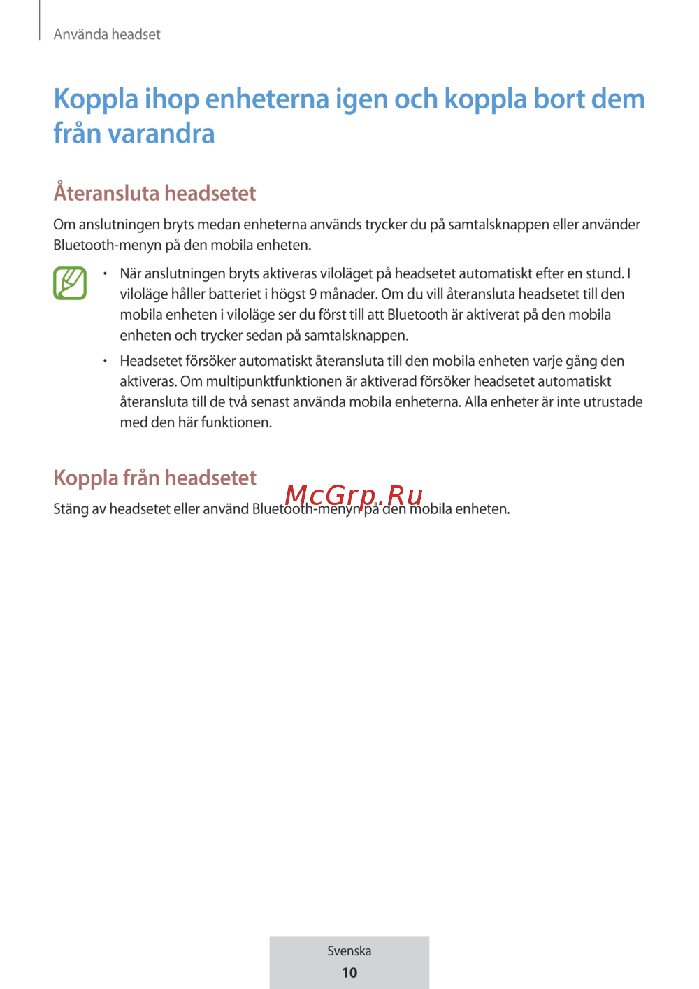 viloläge håller batteriet i högst 9 månader. Om du vill återansluta headsetet till den