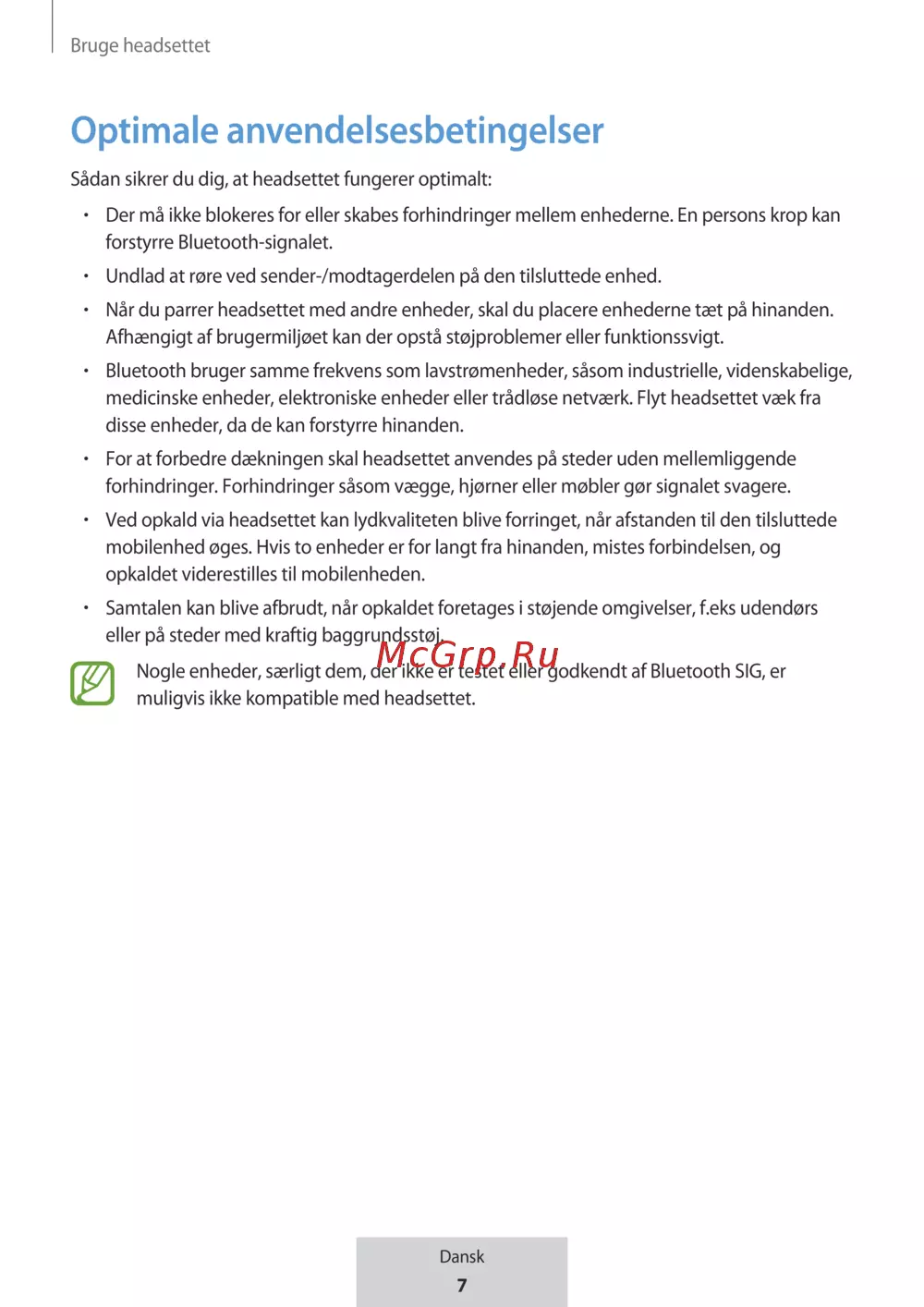 Ved opkald via headsettet kan lydkvaliteten blive forringet, når afstanden til den tilsluttede