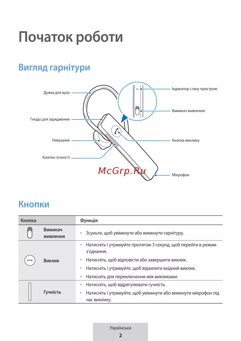 Зсуньте, щоб увімкнути або вимкнути гарнітуру.