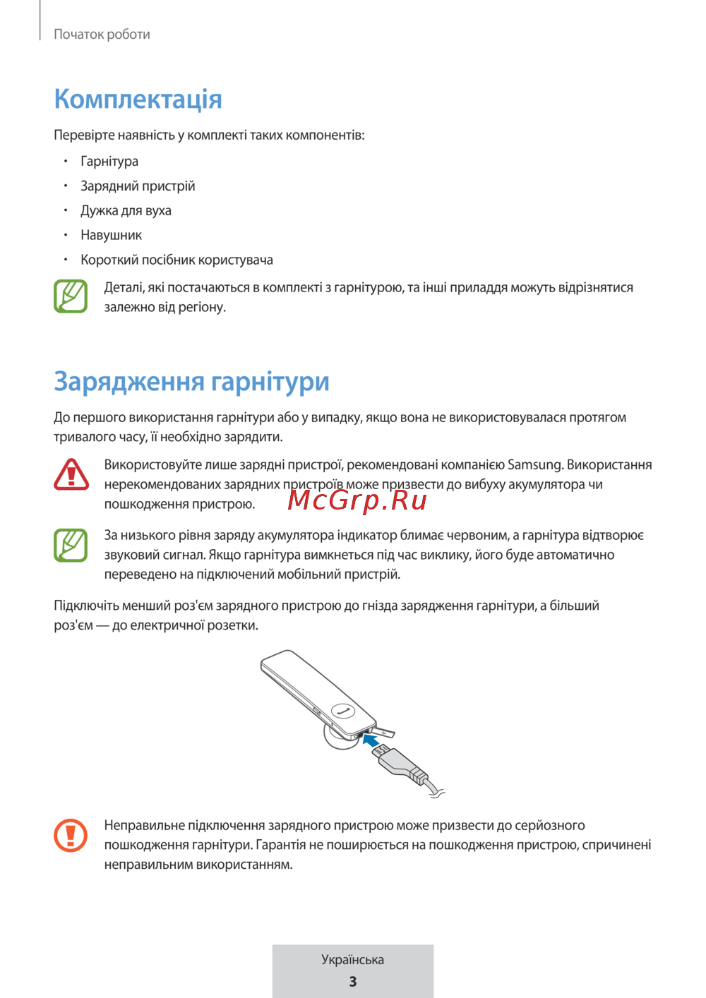 пошкодження гарнітури. Гарантія не поширюється на пошкодження пристрою, спричинені