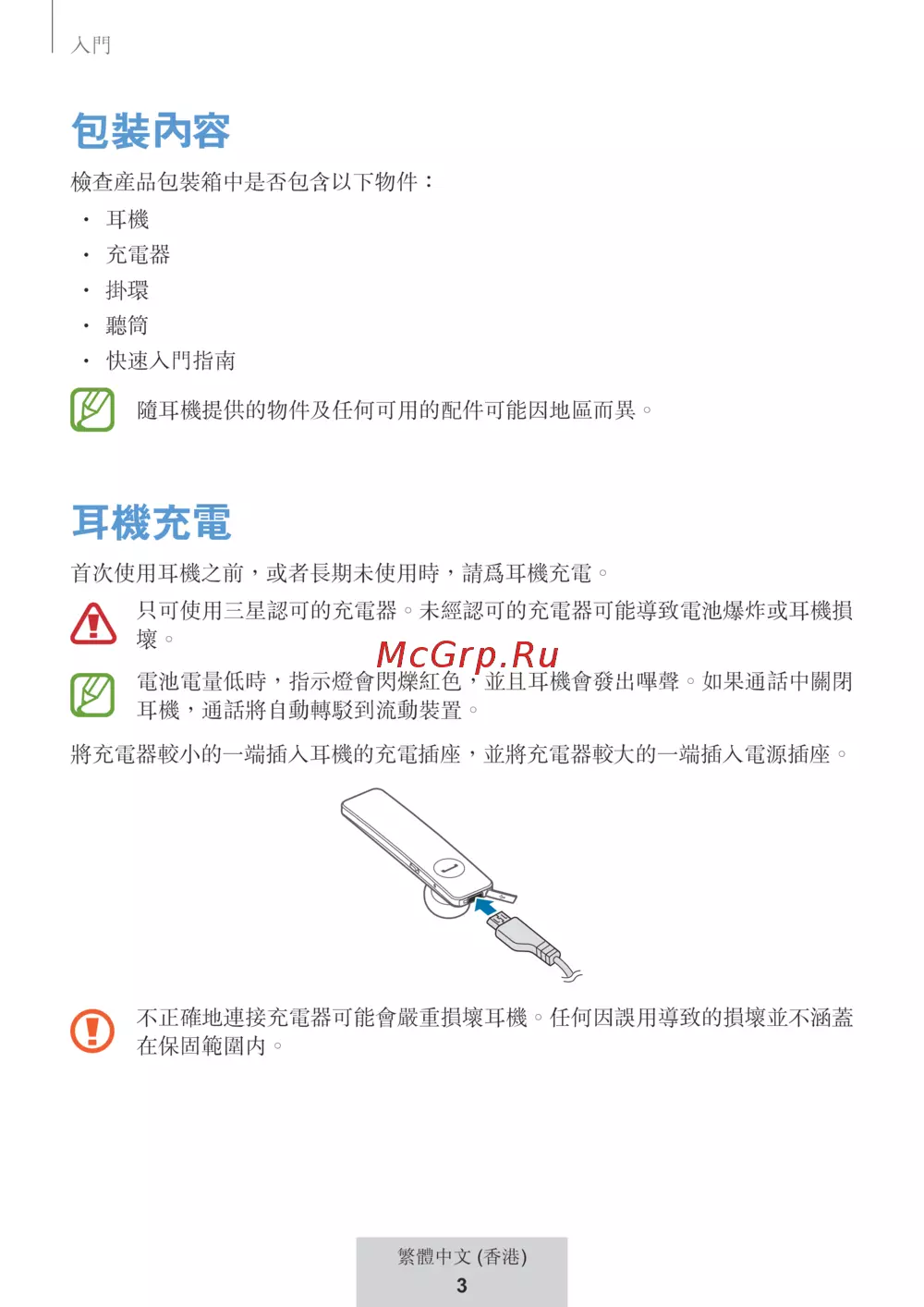 只可使用三星認可的充電器。未經認可的充電器可能導致電池爆炸或耳機損