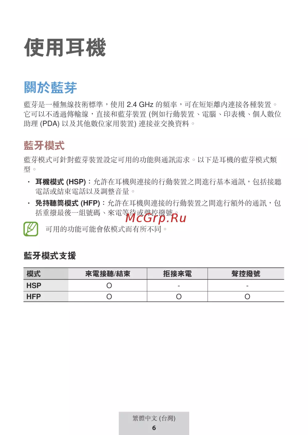 免持聽筒模式 (HFP):允許在耳機與連接的行動裝置之間進行額外的通訊,包