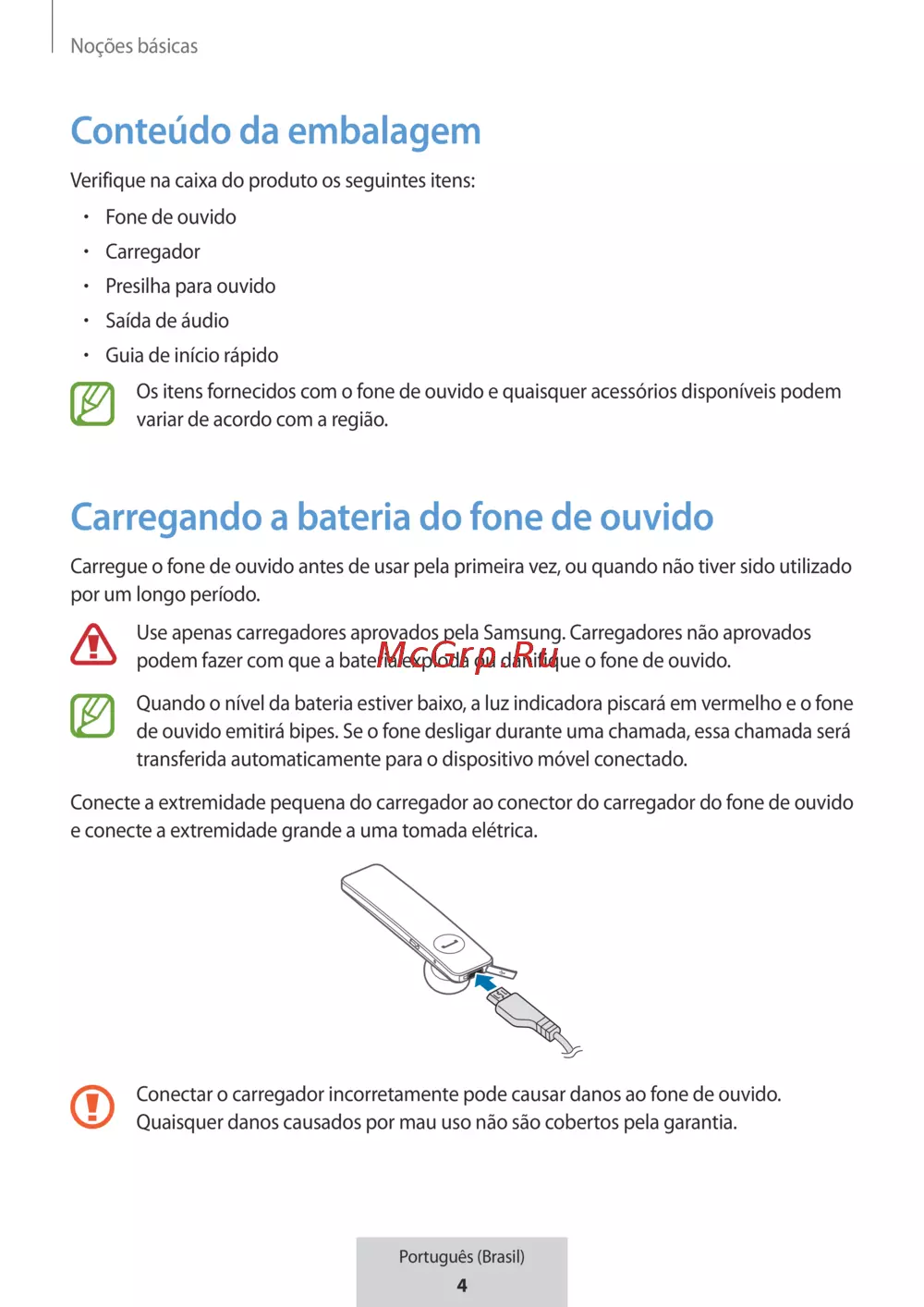 Conectar o carregador incorretamente pode causar danos ao fone de ouvido.