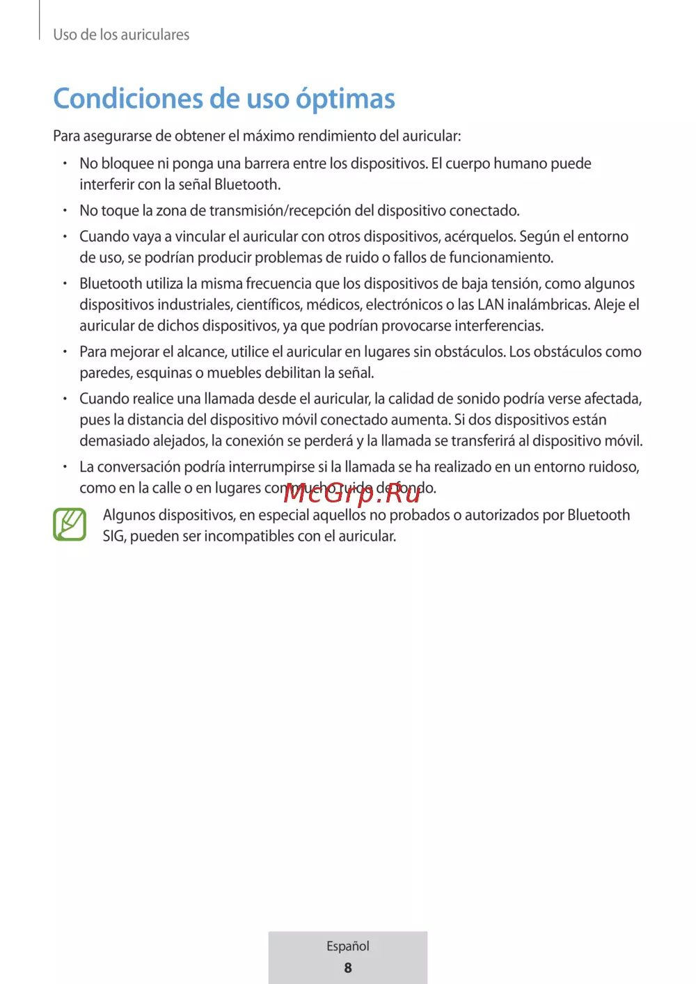 auricular de dichos dispositivos, ya que podrían provocarse interferencias.