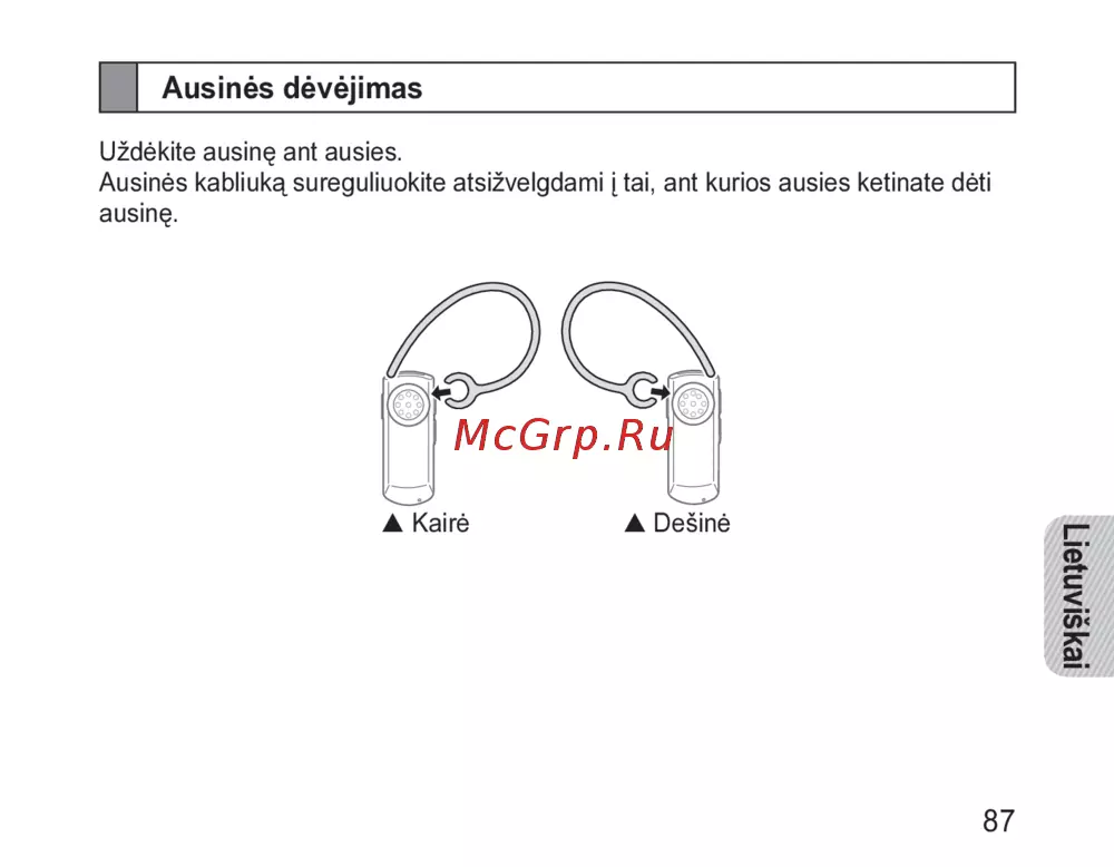 Ausinės kabliuką sureguliuokite atsižvelgdami į tai, ant kurios ausies ketinate dėti