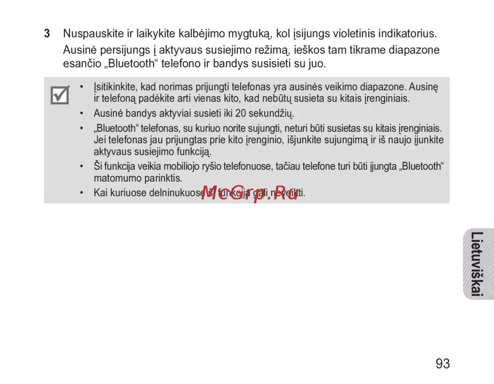 Samsung HM1000 [95/132] Nuspauskite ir laikykite kalbėjimo mygtuką kol įsijungs violetinis indikatorius ausinė persijungs į aktyvaus susiejimo režimą ieškos tam tikrame diapazone esančio bluetooth telefono ir bandys susisieti su juo