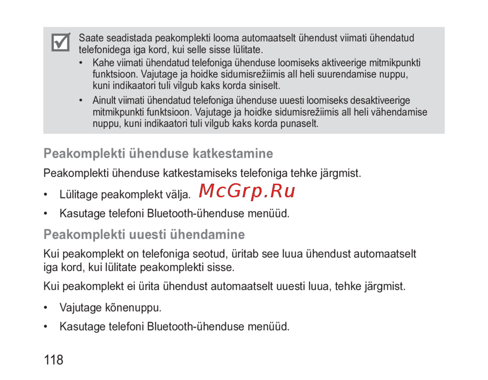 - Kui peakomplekt on telefoniga seotud üritab see luua ühendust automaatselt iga kord kui lülitate peakomplekti sisse p.120