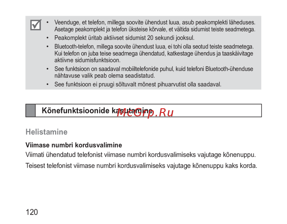 - Kui peakomplekt on telefoniga seotud üritab see luua ühendust automaatselt iga kord kui lülitate peakomplekti sisse p.120
