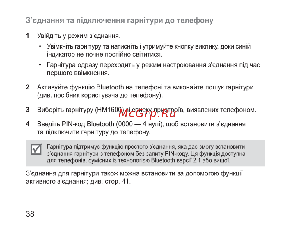 з’єднання гарнітури з телефоном без запиту PIN-коду. Ця функція доступна