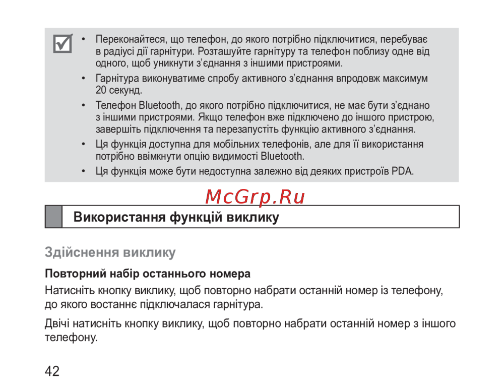 Samsung BHM1600 [44/133] Повторний набір останнього номера натисніть кнопку виклику щоб повторно набрати останній номер із телефону до якого востаннє підключалася гарнітура