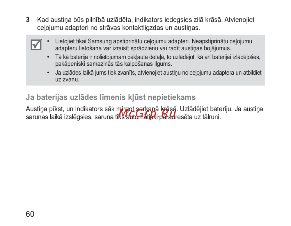 Samsung BHM1600 [62/133] Ja baterijas uzlādes līmenis kļūst nepietiekams